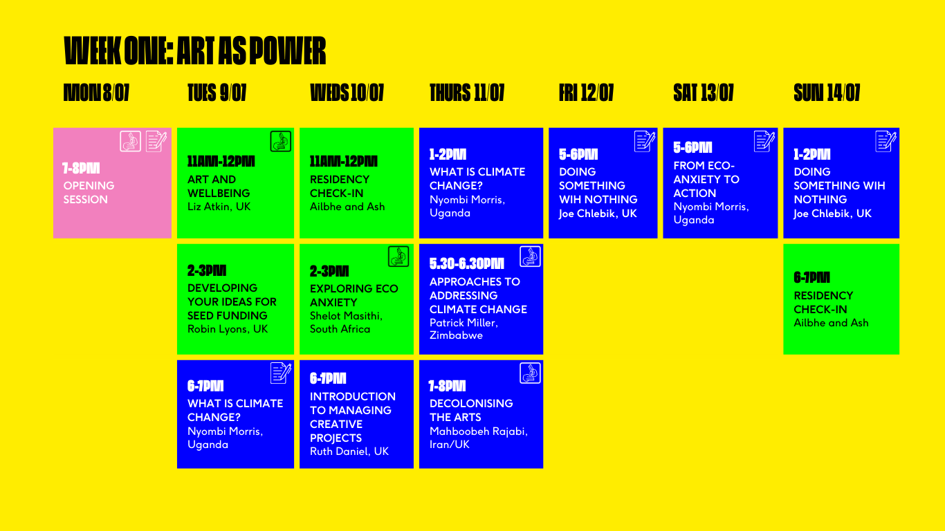 The online residency content was driven by In Place of War’s change maker network around the world, as well as guided by the young people involved in the programme. Both weeks of the residency have a theme. Week one focused on Art as Power: how creativity can act as a powerful tool in the fight against climate change. Week two centred on Community + Climate Activism: how to use art to engage people around you in climate activism.